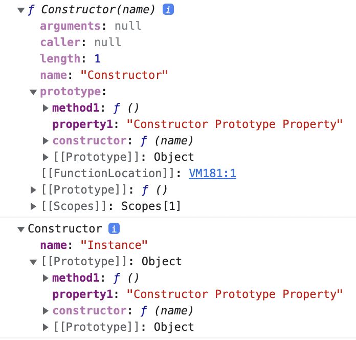 var Constructor = function (name) { this.name = name; }; Constructor.prototype.method1 = function() {}; Constructor.prototype.property1 = 'Constructor Prototype Property'; var instance = new Constructor('Instance'); console.dir(Constructor); console.dir(instance);위의 코드를 실행하고 생성자와 인스턴스의 내부를