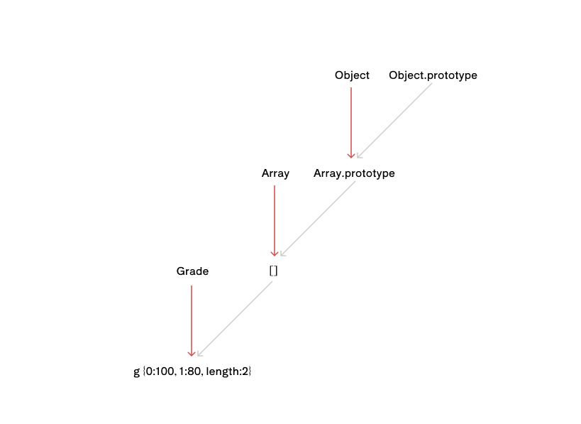 위의 예제에서는 인스턴스에서 배열 메서드를 직접 사용할 수 있게끔 만들기 위해 Grade.prototype이 배열의 인스턴스를 바라보게 하도록 만들었다. 이를 도식화 하면 다음과 같다.아래의 도식이